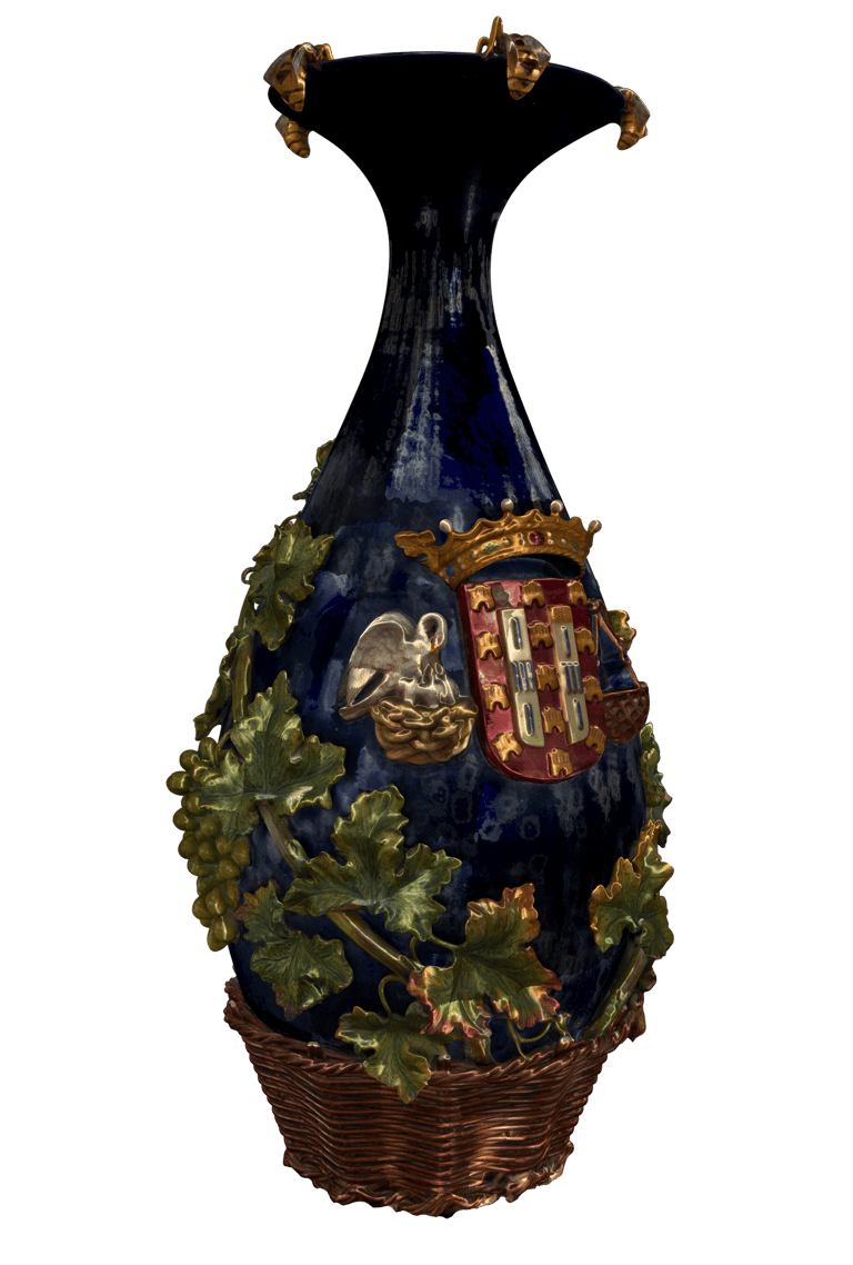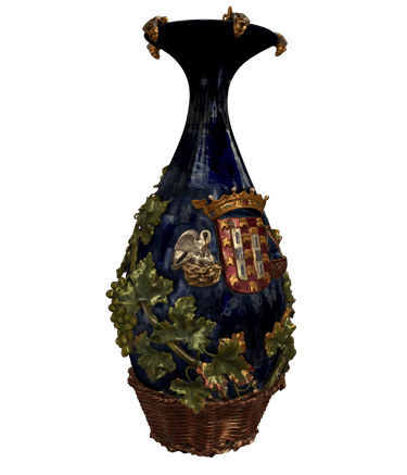 Jarra proveniente do hospital termal Rainha D. Leonor. De cor azul escura em balaústre, poisando em cesto de vime castanho.